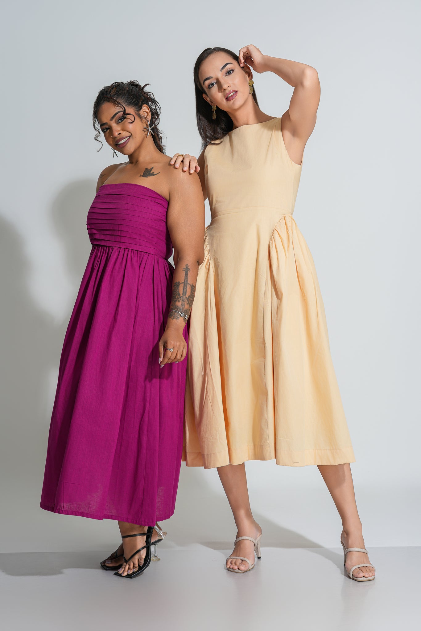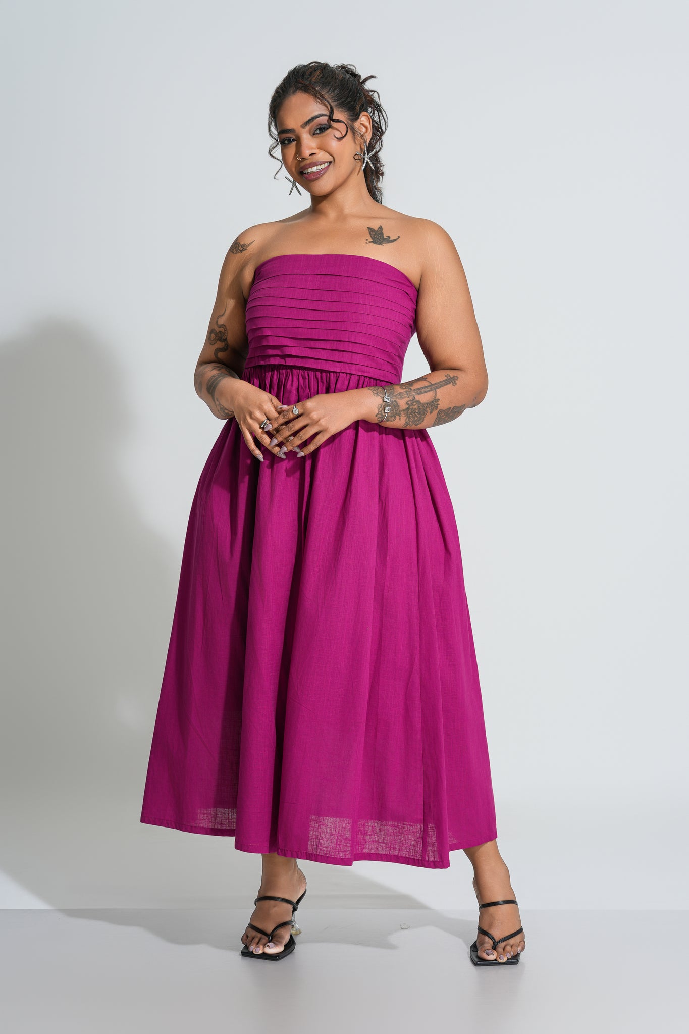 | Effortlessly Chic: Strapless design for a modern, feminine look. Breathable Comfort: Crafted from a soft cotton-linen blend for all-day ease. Flattering Fit: Elasticated back for flexible, comfortable wear. Elegant Details: Delicate pleats on the front bodice add texture and charm. Perfect Length: Midi silhouette for a versatile, day-to-night style. |