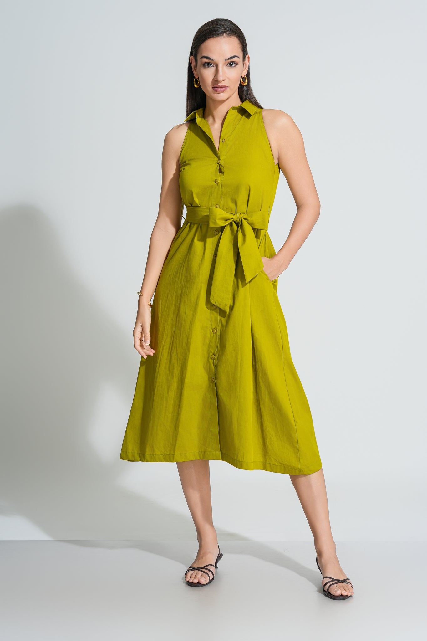 Crafted from soft, breathable cotton fabric for all-day comfort Sleeveless design keeps it cool and easy to layer Classic collar detail adds a smart, structured touch Button-down placket for effortless wear and styling Detachable fabric belt to cinch the waist or wear relaxed Handy 02 side pockets — practical and stylish Midi length for a versatile, flattering silhouette