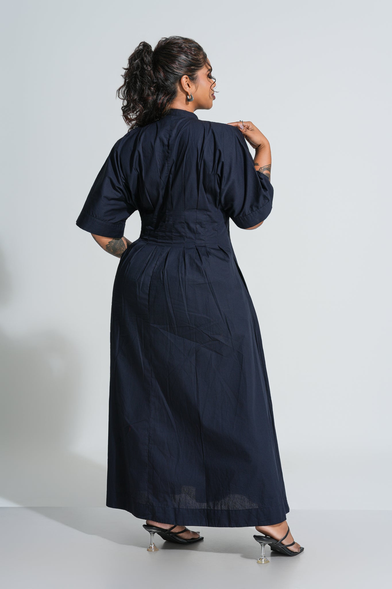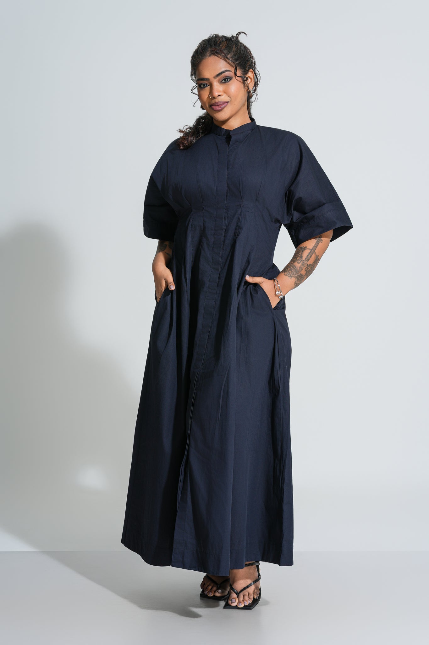 Made from soft, breathable cotton fabric for all-day comfort. 3/4 sleeves with banded cuffs for a polished, relaxed finish. Elegant Chinese collar with a clean hidden button placket for a minimal look. Delicate pin-tuck detailing at the waist (front & back) adds subtle structure and shape. Functional front button design for easy wear and versatility. 02 side pockets for added ease and everyday convenience. Flowy maxi length creates a graceful silhouette