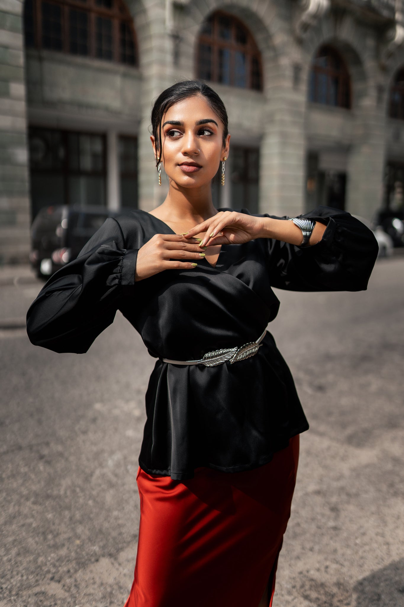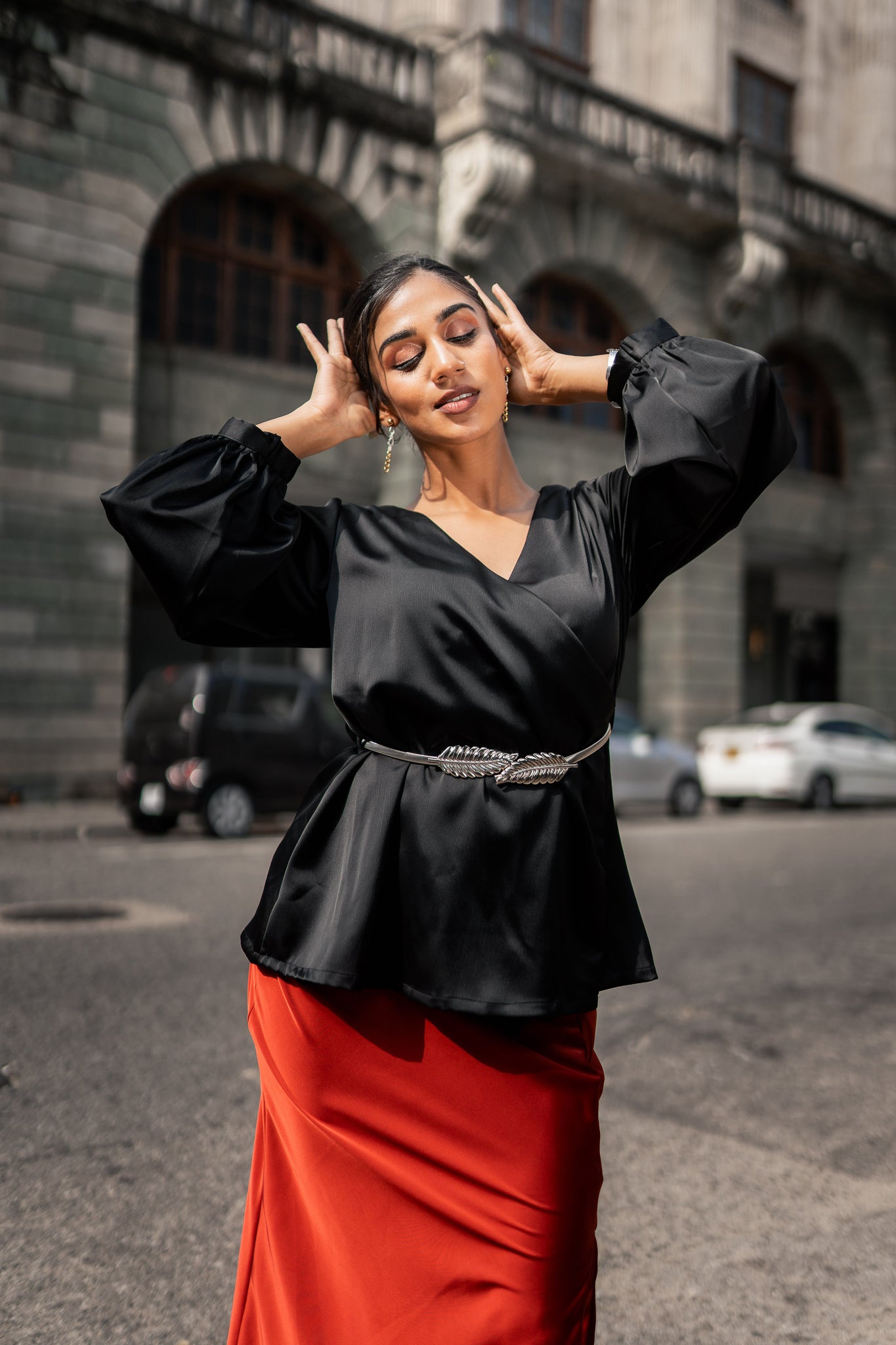 Embrace effortless elegance with the Yasmin Tie Top in Black. This wrap style design features a flattering silhouette that cinches at the waist, complemented by a sophisticated V-neckline and long sleeves in luxurious satin fabric with gentle stretch. The included decorative belt adds polish and definition, making it ideal for transitioning from office to evening occasions. Modern, feminine, and versatile a wardrobe essential for any occasion.