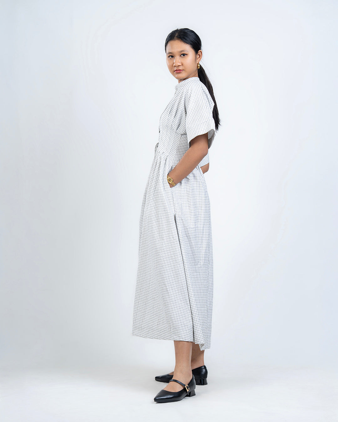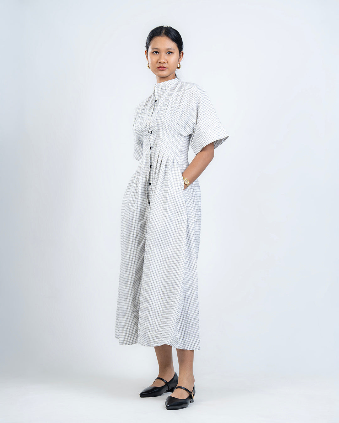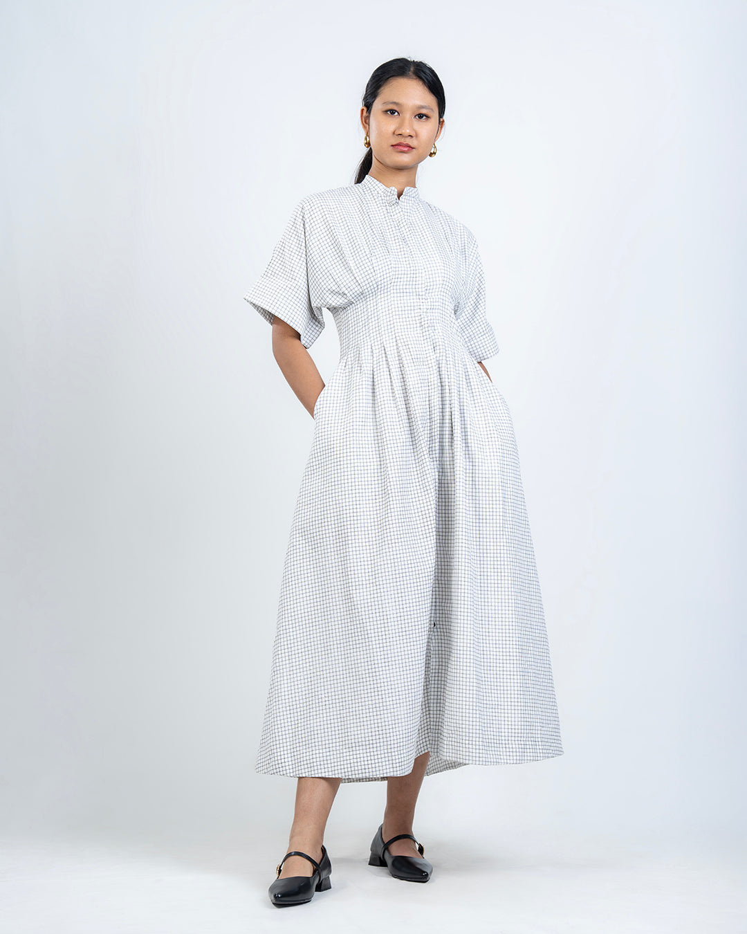 Crafted from soft, breathable cotton, this maxi dress combines effortless elegance with thoughtful design details. The 3/4 banded sleeves and Chinese collar create a polished silhouette, while hidden button plackets maintain a clean aesthetic. Delicate pin-tuck detailing at the waist provides subtle structure and definition. Functional front buttons and dual side pockets ensure practicality, while the flowing maxi length and refined hem band detailing deliver a graceful, sophisticated finish perfect for all-day wear.