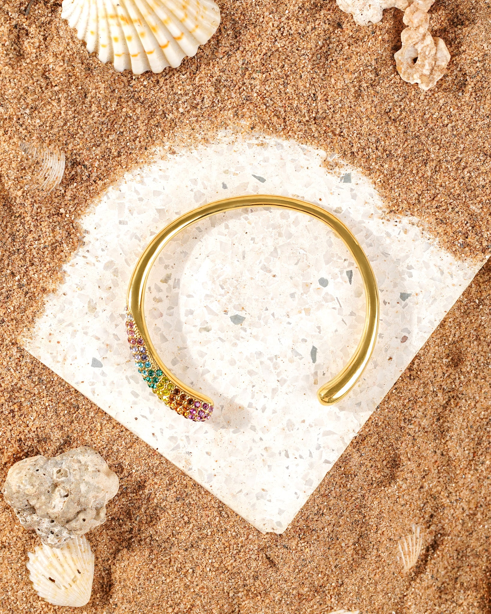 The Solara Cuff showcases understated luxury through its 18k gold plating construction , elevated by a striking diamond detail that catches light with every movement.