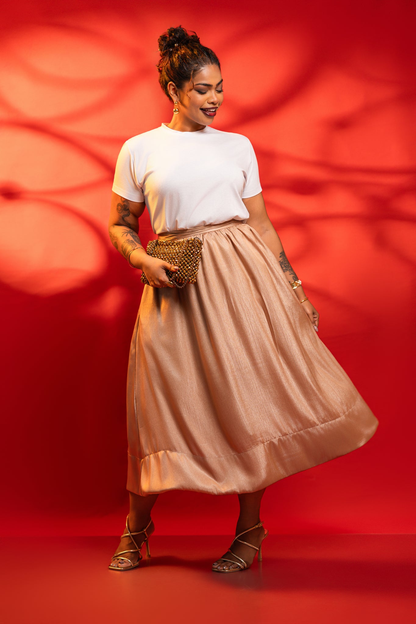 The Eve Lana Midi Skirt in Goldenor combines understated elegance with festive presence. Its flowing midi silhouette drapes gracefully while the voluminous hem creates movement and visual drama—ideal for evening events and celebrations. Crafted from luxurious chiffon crepe with a subtle shimmer, the fabric catches light beautifully and moves with effortless fluidity. A center back zipper ensures a clean, polished finish, while the fitted waistband delivers both comfort and tailored structure. This piece transitions seamlessly from formal occasions to upscale gatherings, offering a sophisticated, celebration-ready option that requires minimal styling effort.