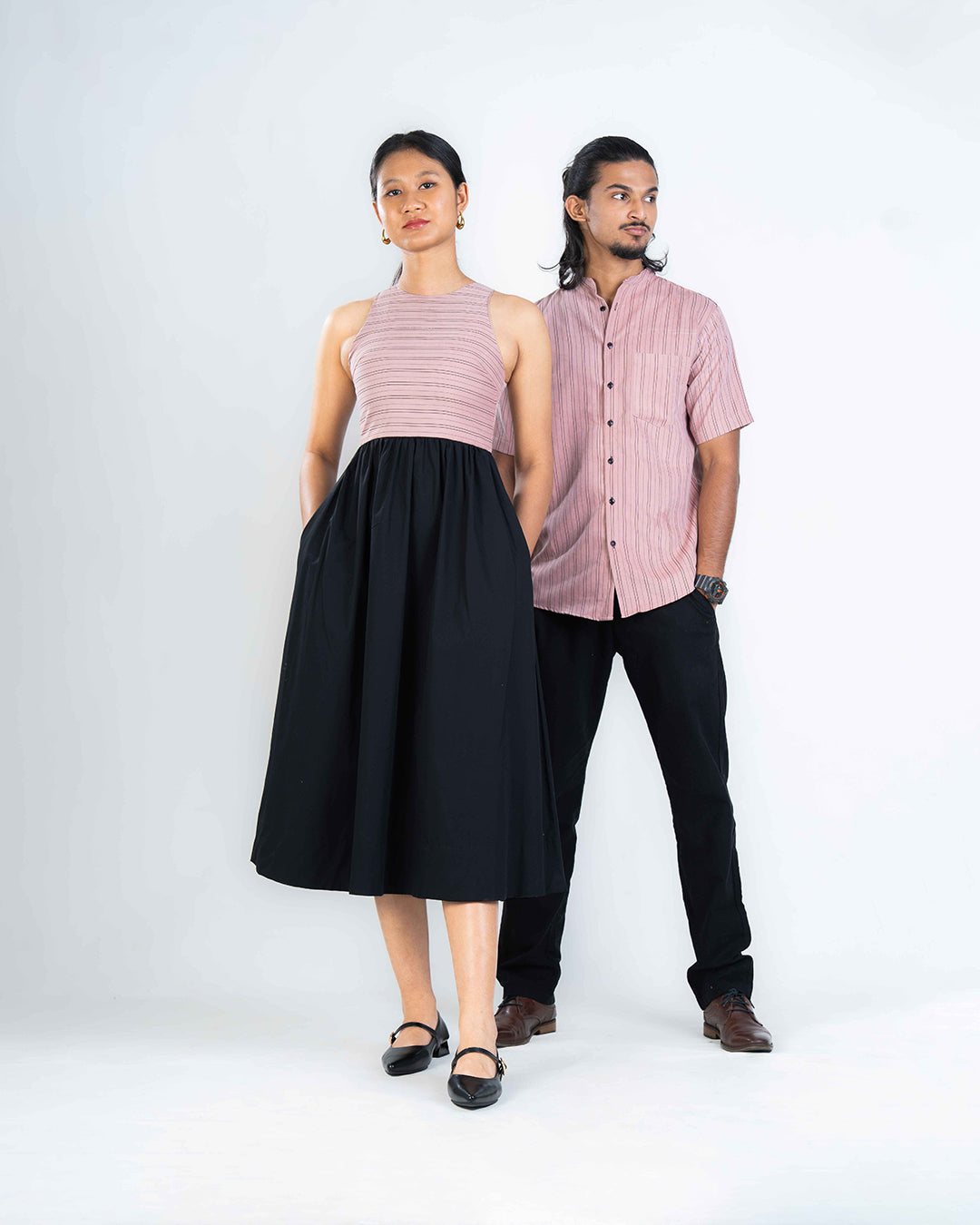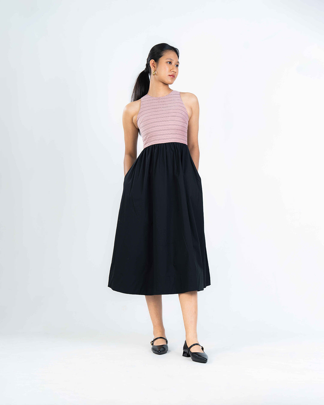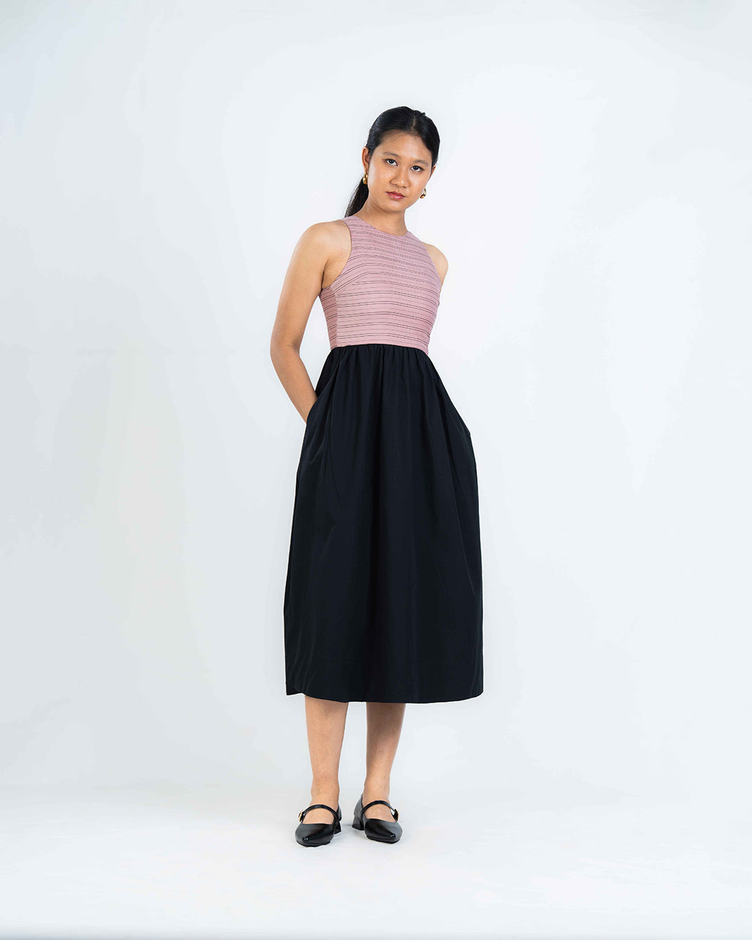 Ivory Contrast Midi Dress - Victoria combines textured striped linen on top with a soft cotton skirt for effortless summer elegance. The sleeveless round neckline keeps you cool while the back zipper closure ensures a polished fit. Practical side pockets add everyday functionality to this modern two-tone design. The midi length flatters all silhouettes, transitioning seamlessly from daytime occasions to evening wear. Perfect for warm-weather styling that balances comfort with contemporary sophistication.