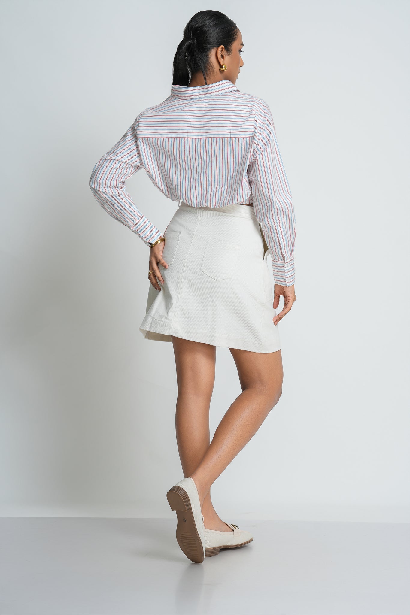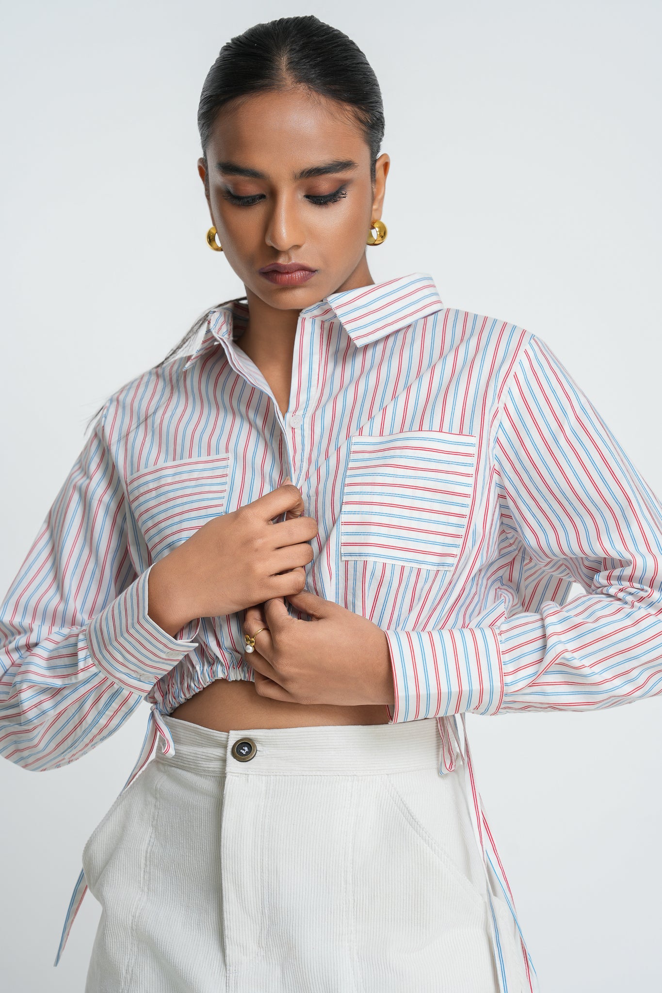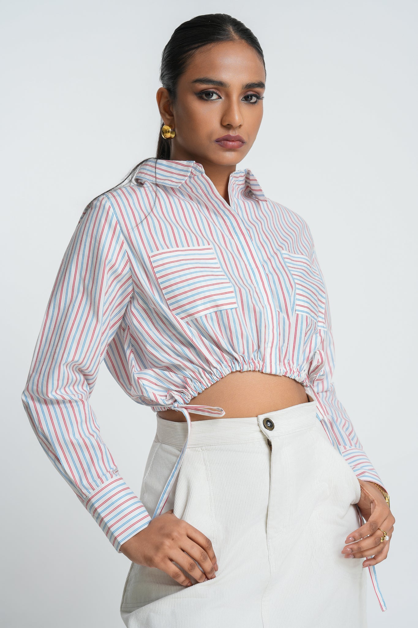 The Luna Ruched Top in Old Port combines premium soft cotton with thoughtful design details for effortless versatility. Breathable striped fabric keeps you comfortable throughout the day, while adjustable fabric tie cords on the long sleeves let you customize the fit and silhouette to suit your mood. The cropped cut delivers modern appeal, anchored by a classic collared neckline and hidden front button placket for a polished aesthetic. Functional patch pockets add casual charm without compromising the clean lines. Layer it, dress it down, or wear it solo this piece transitions seamlessly across your wardrobe.