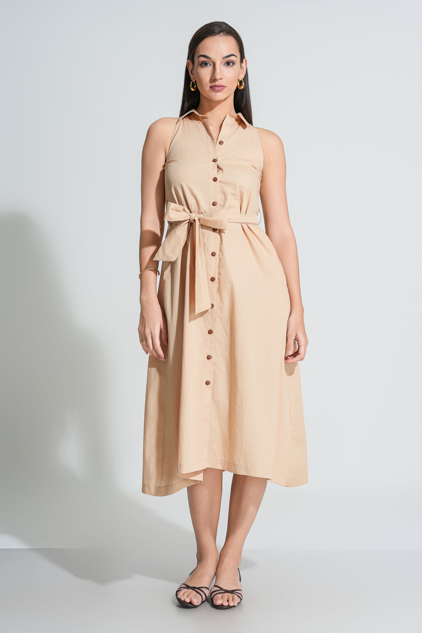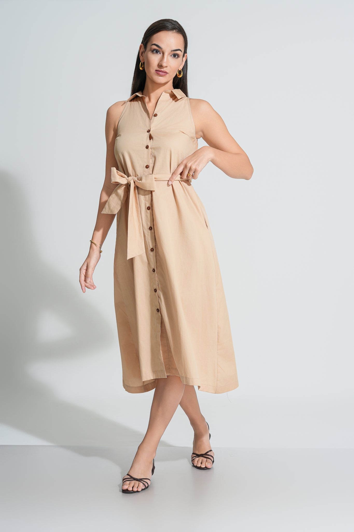 Crafted from soft, breathable cotton fabric for all-day comfort Sleeveless design keeps it cool and easy to layer Classic collar detail adds a smart, structured touch Button-down placket for effortless wear and styling Detachable fabric belt to cinch the waist or wear relaxed Handy 02 side pockets — practical and stylish Midi length for a versatile, flattering silhouette