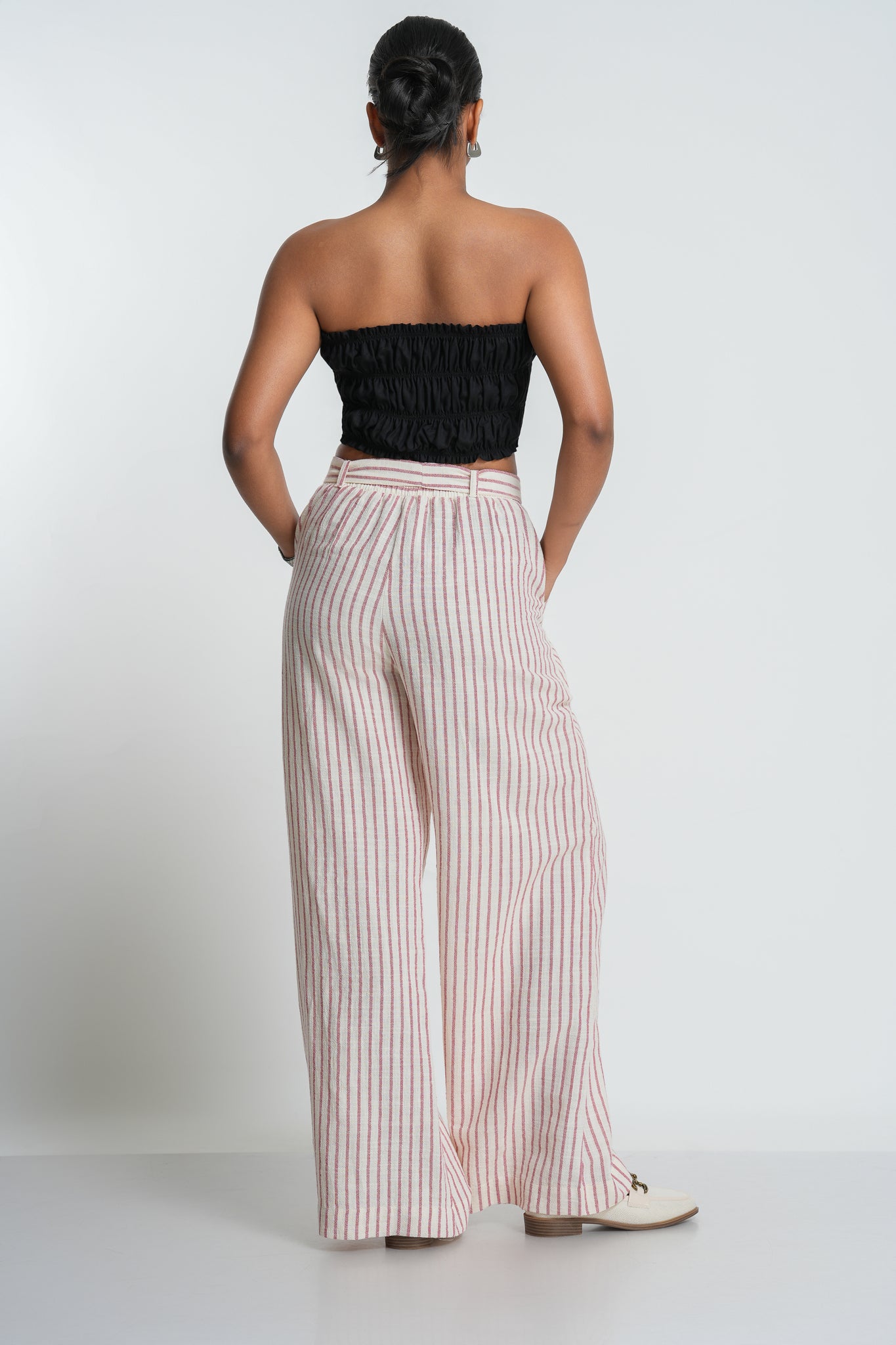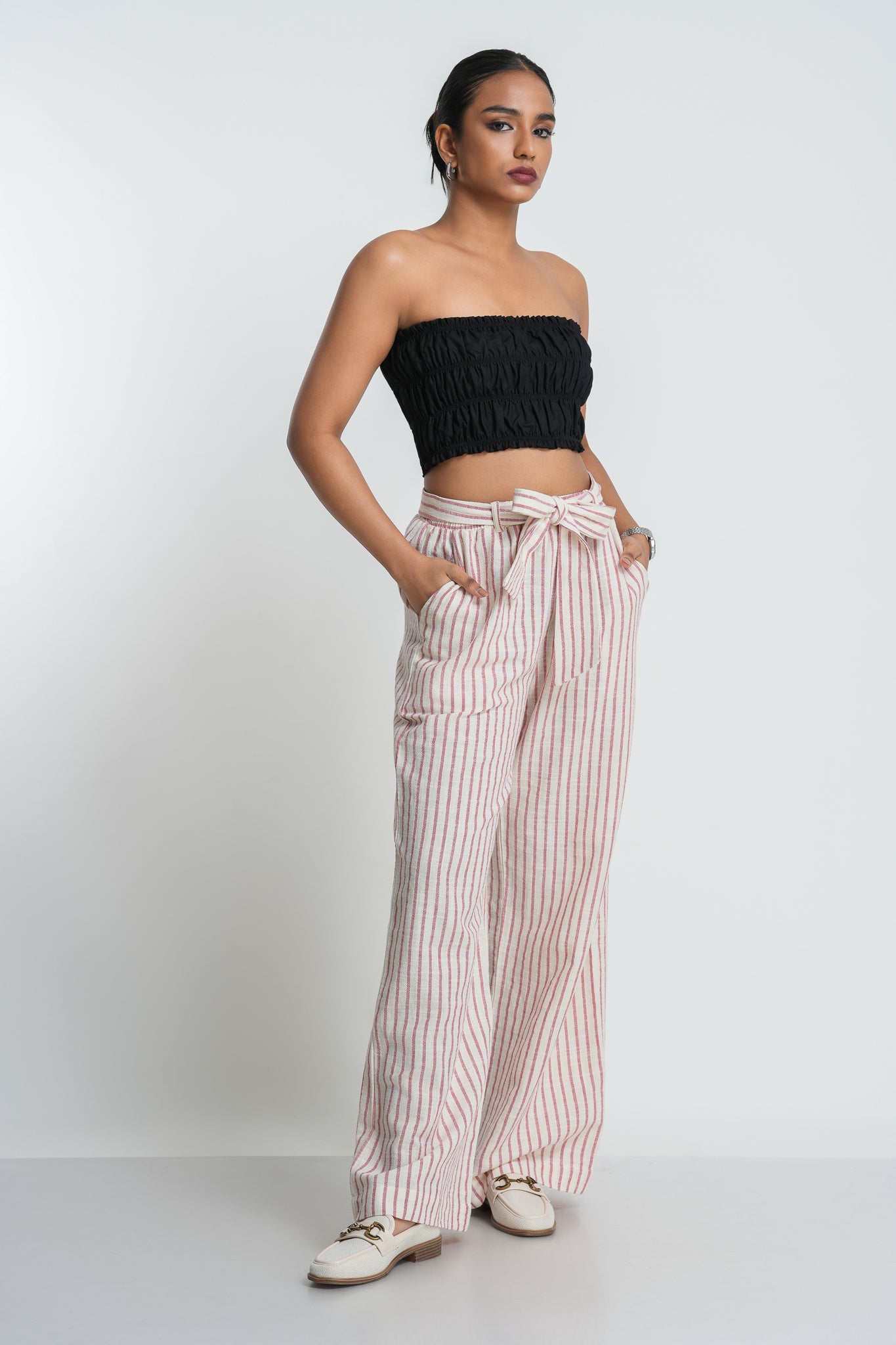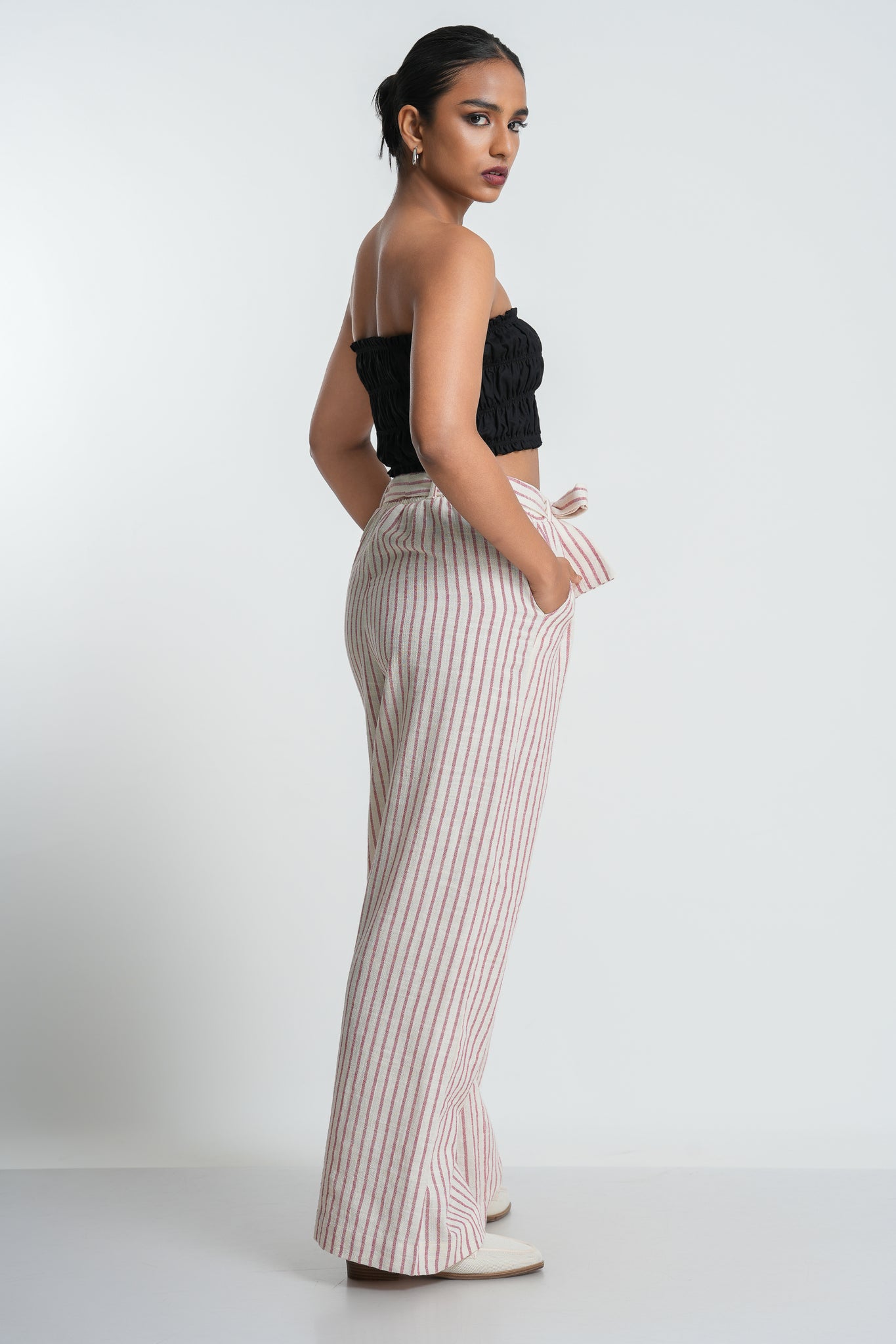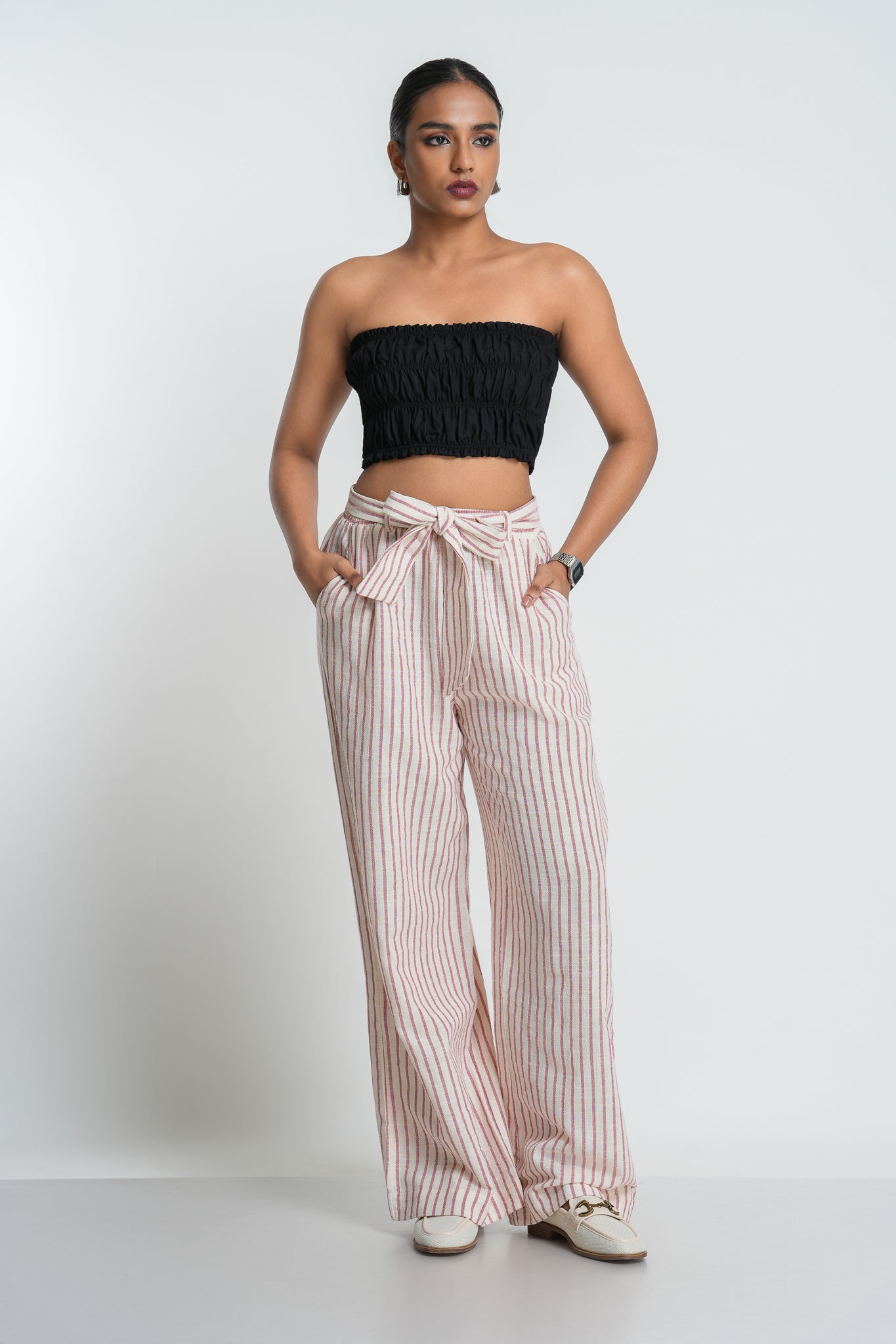 The Nola pant combines relaxed elegance with practical design. Cut in a maxi length, it features an elasticated waistband for adaptive comfort and two functional side pockets. The cotton-linen blend breathes effortlessly while the subtle striped texture adds understated visual depth. An attachable fabric belt with loops lets you define your silhouette on demand. Versatile enough for weekend errands, casual office settings, or leisurely outings this is everyday sophistication without compromise.