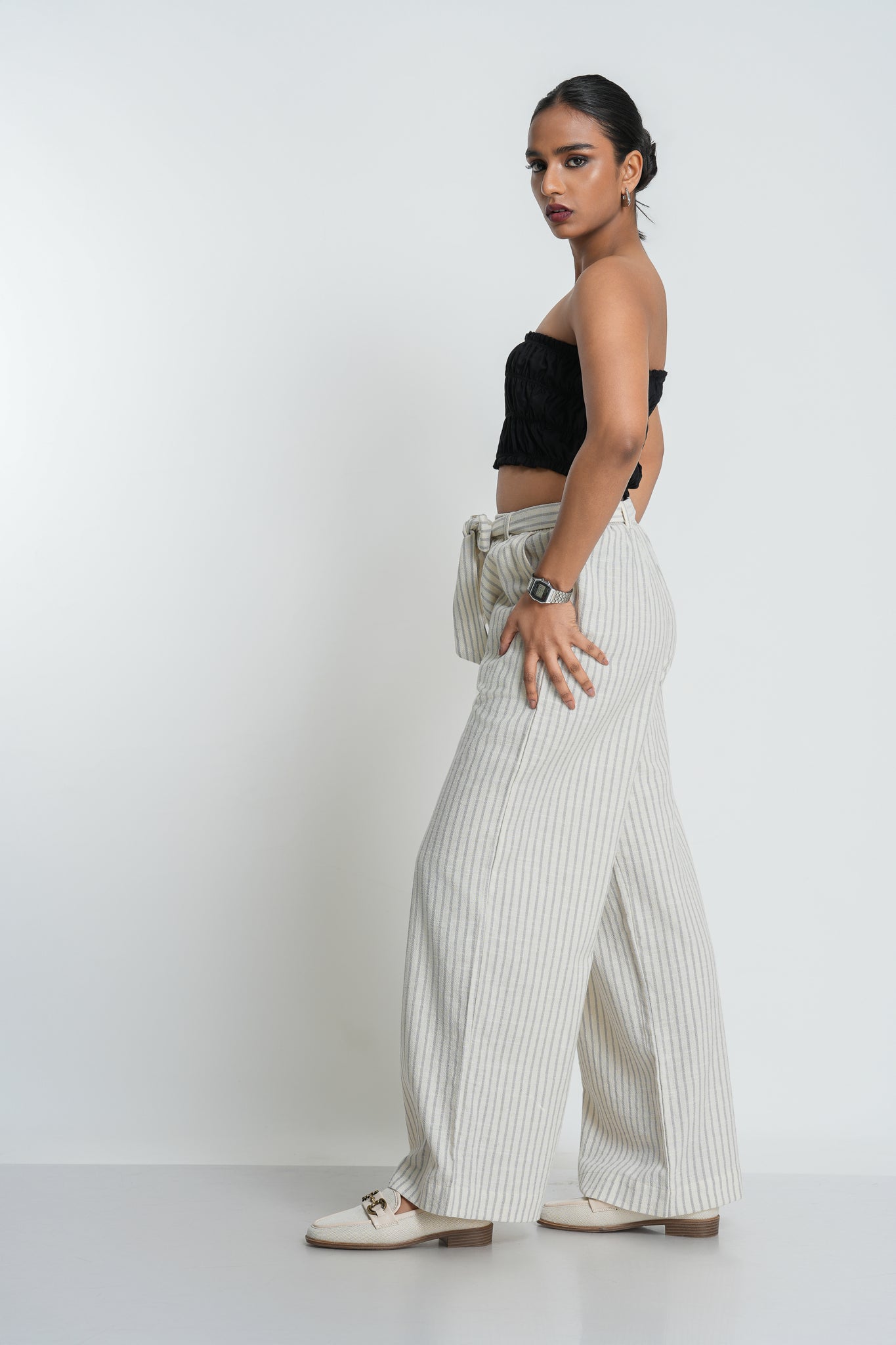 The Nola pant combines relaxed elegance with practical design. Cut in a maxi length, it features an elasticated waistband for adaptive comfort and two functional side pockets. The cotton-linen blend breathes effortlessly while the subtle striped texture adds understated visual depth. An attachable fabric belt with loops lets you define your silhouette on demand. Versatile enough for weekend errands, casual office settings, or leisurely outings this is everyday sophistication without compromise.