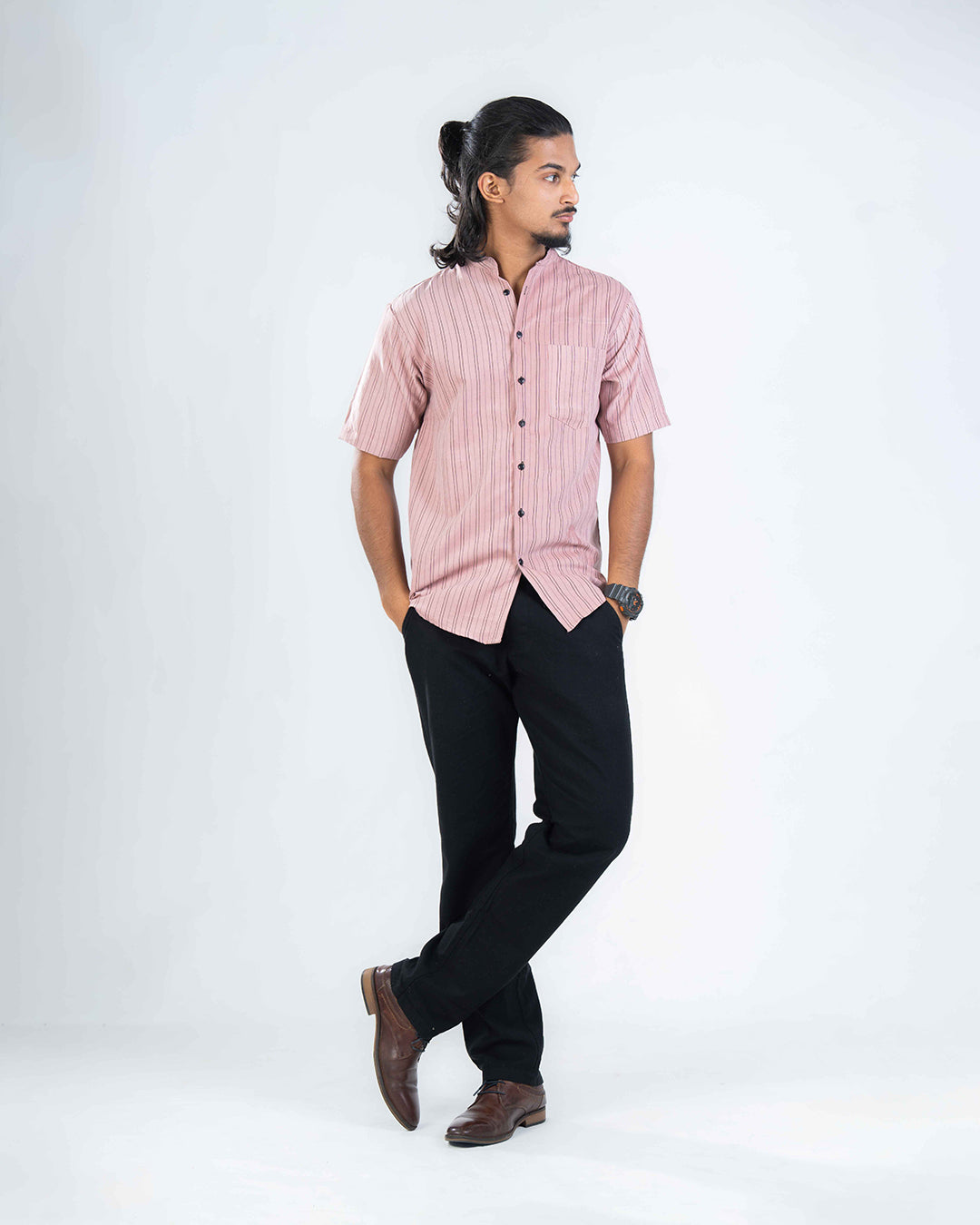 Crafted from premium polyester, this weekend shirt delivers a lightweight, breathable foundation that resists wrinkles and maintains its polished appearance throughout the day. The modern Chinese collar creates a refined silhouette minimal yet distinctly contemporary while tailored short sleeves offer comfort in warm weather. Soft against the skin and engineered for quick-dry performance, it transitions seamlessly from casual to smart-casual settings. Pair with jeans, chinos, or trousers for effortless versatility. Low-maintenance fabric means less time on upkeep, more time enjoying your weekend.