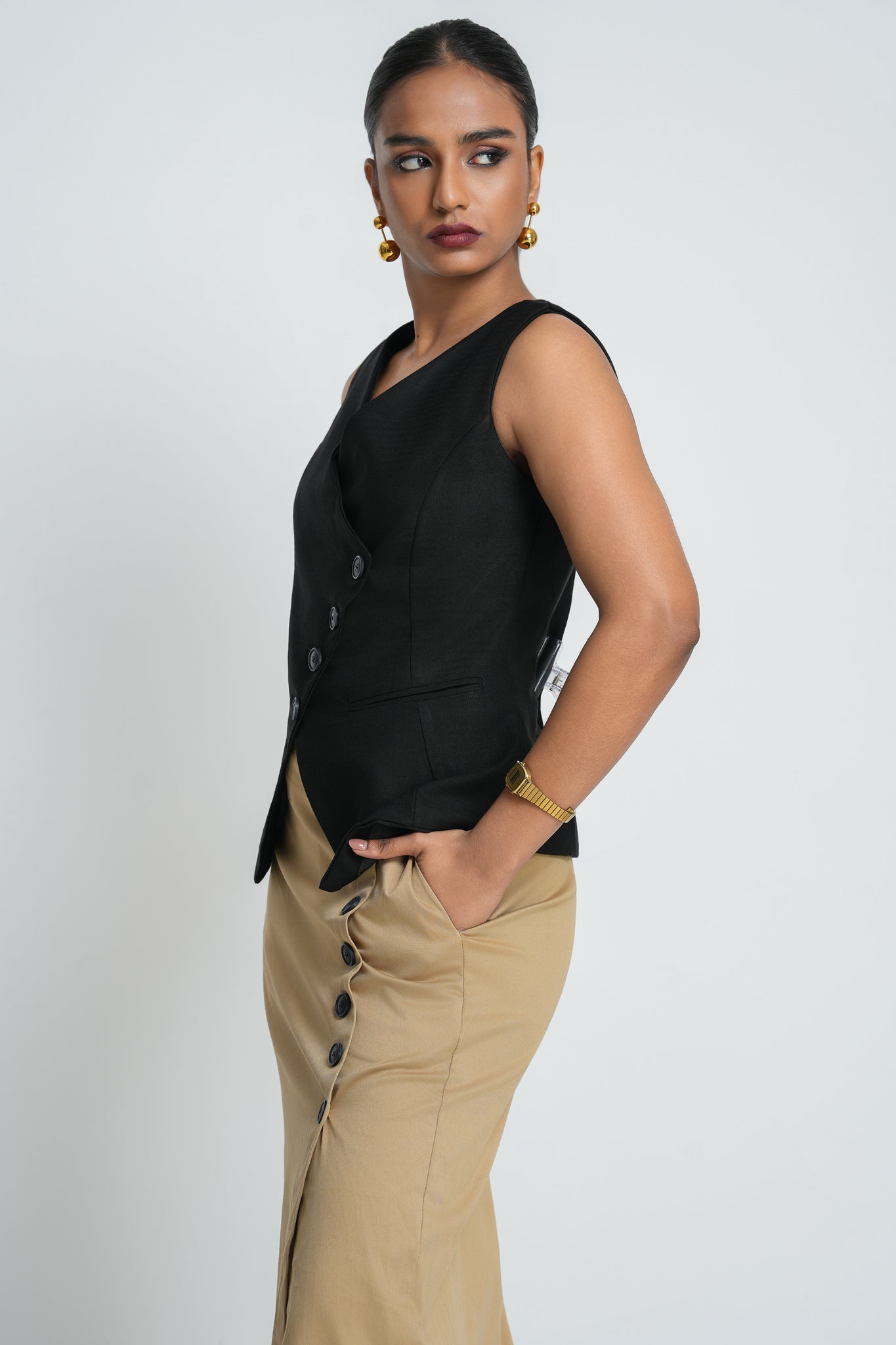 Veronica Waist Coat - Black Elevate your layering game with this expertly crafted sleeveless waistcoat. The V-neck silhouette and princess line cut work together to create a refined, structured fit that flatters effortlessly. A slant hem adds contemporary edge while angled button details provide understated sophistication. Practical front pockets keep the design clean and functional. Crafted from soft cotton with subtle stripe texture, it breathes beautifully against the skin while adding visual dimension. Wear it over shirts, dresses, or lightweight tops equally polished in professional settings or casual moments.