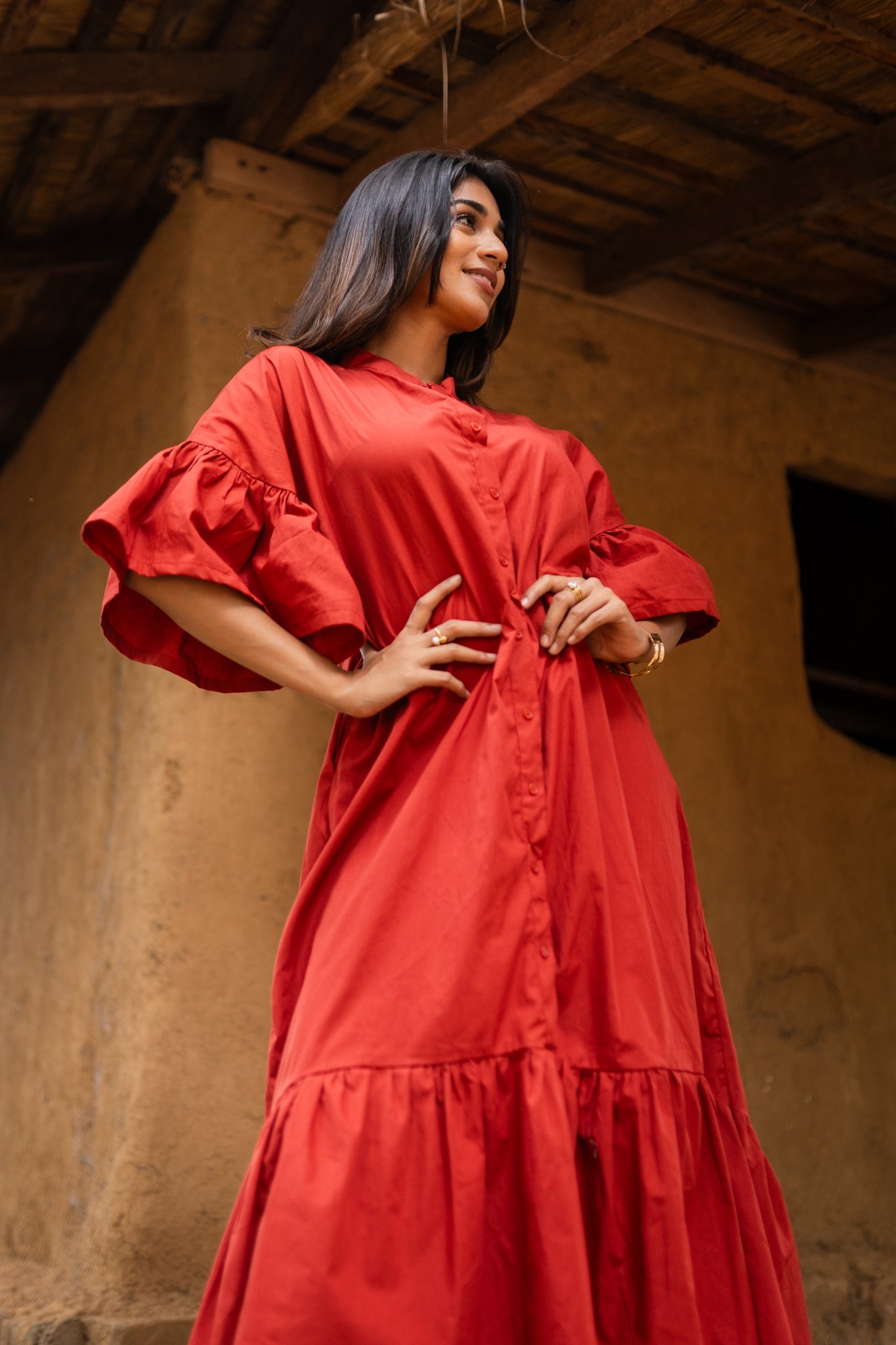 The Victoria High-Low Dress combines effortless elegance with thoughtful design details. A flowing high-low hem creates movement and visual interest, while the structured mandarin collar and 3/4 sleeves deliver a refined, contemporary silhouette. The front button closure allows for versatile styling wear it buttoned for a polished look or open as a layering piece. Soft frill detailing at the hem adds a graceful, feminine touch that sets it apart. Crafted from breathable cotton, this dress keeps you comfortable throughout the day without sacrificing style. Dual side pockets provide practical convenience for everyday essentials. Whether you're heading to the office, running errands, or gathering with friends, the Victoria transitions seamlessly from casual to put-together with minimal effort. A modern wardrobe essential that balances comfort, functionality, and understated sophistication.