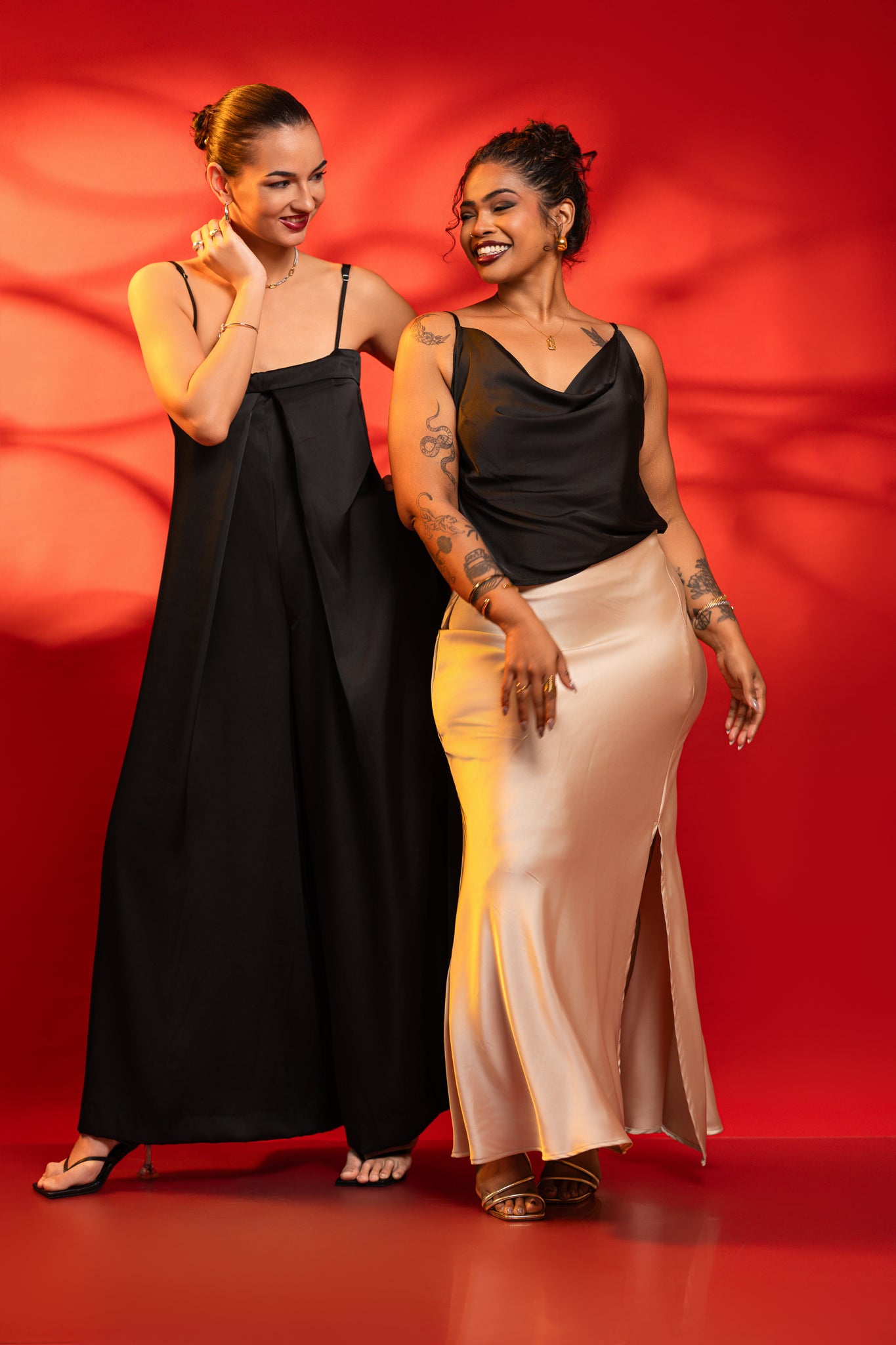 Elevate your festive wardrobe with this sophisticated jumpsuit, crafted from luxurious satin that catches light with understated elegance. Delicate slim straps frame the shoulders in a modern, feminine silhouette, while strategic front pleating defines your shape with refined precision. A structured neck band adds architectural interest to the neckline, and functional side pockets deliver practical style. The back zipper ensures a seamless, polished appearance, while the lightweight, flowing fabric moves effortlessly through evening events and celebrations. A single-piece statement that combines comfort, confidence, and timeless sophistication.