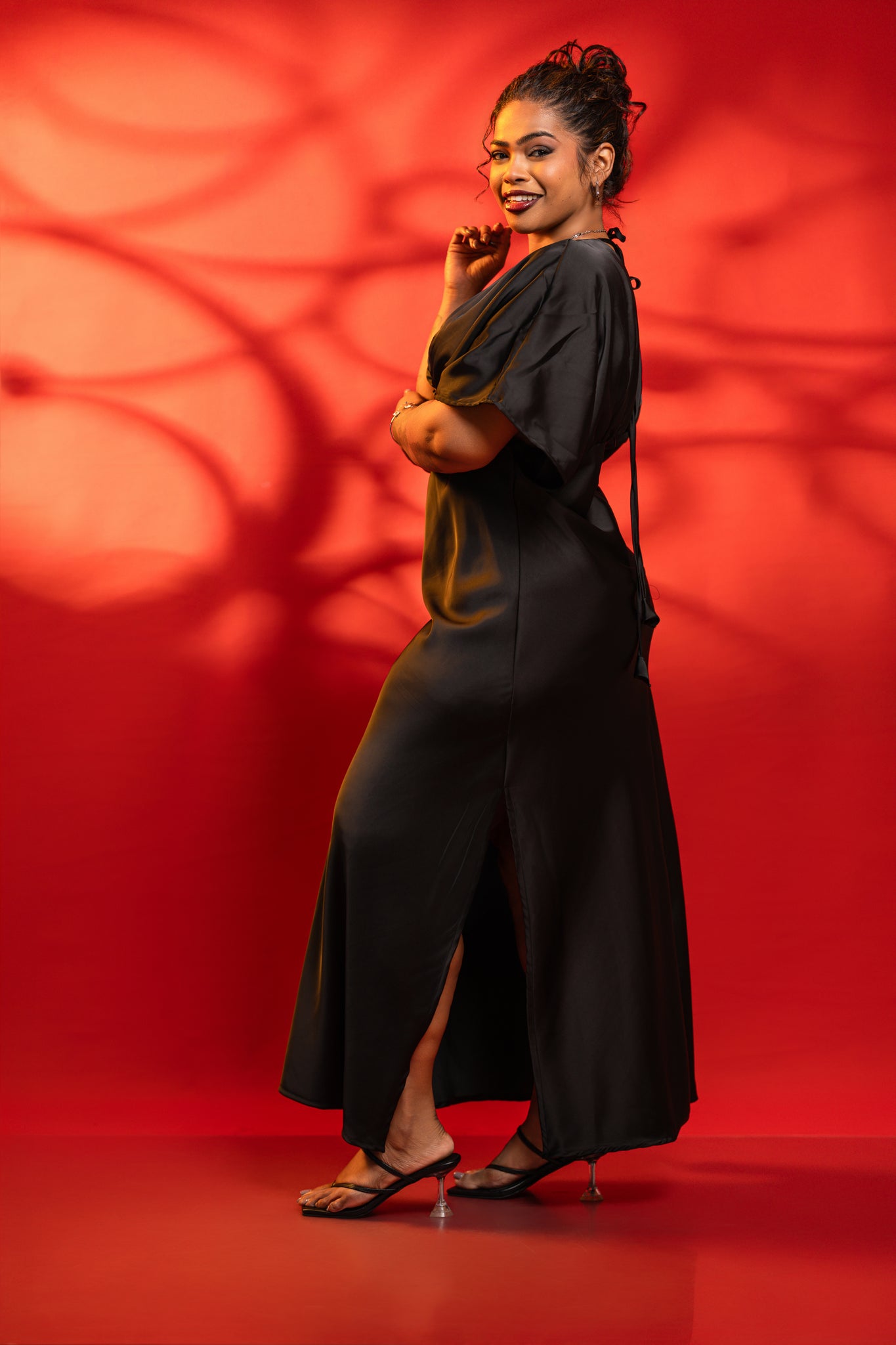 Luxurious satin finish that glides beautifully and adds a soft festive glow.Elegant maxi silhouette designed to flatter with graceful movement.Chic side-slit opening for a touch of drama and effortless walkability.Delicate back-neck tie detail that adds a refined, feminine finish.3/4 sleeves offering the perfect balance of coverage and style.Lightweight and flowy ideal for festive evenings and celebrations.Comfort-first fit that feels smooth on the skin while looking timeless.Perfect festive pick for parties, dinners, and standout holiday moments.