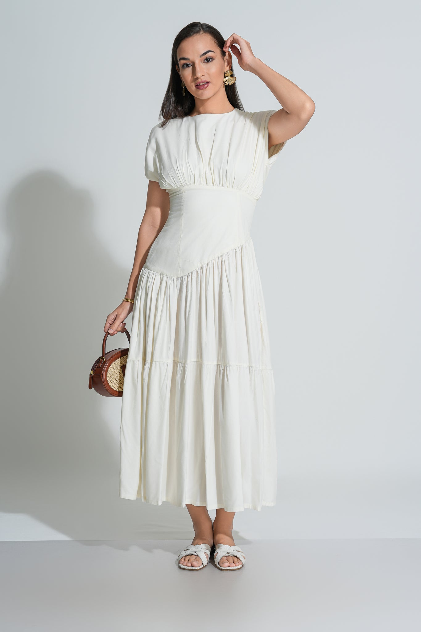 Experience effortless elegance in this rayon maxi dress, engineered for comfort and style. The breathable fabric moves with you throughout the day, while cascading tiers add dimension and graceful flow. A refined waist seam accentuates your silhouette naturally, complemented by delicate cap sleeves that balance coverage with sophistication. The concealed back zipper ensures a seamless, secure fit. Offered in carefully curated pastel solids that embody timeless refinement.
